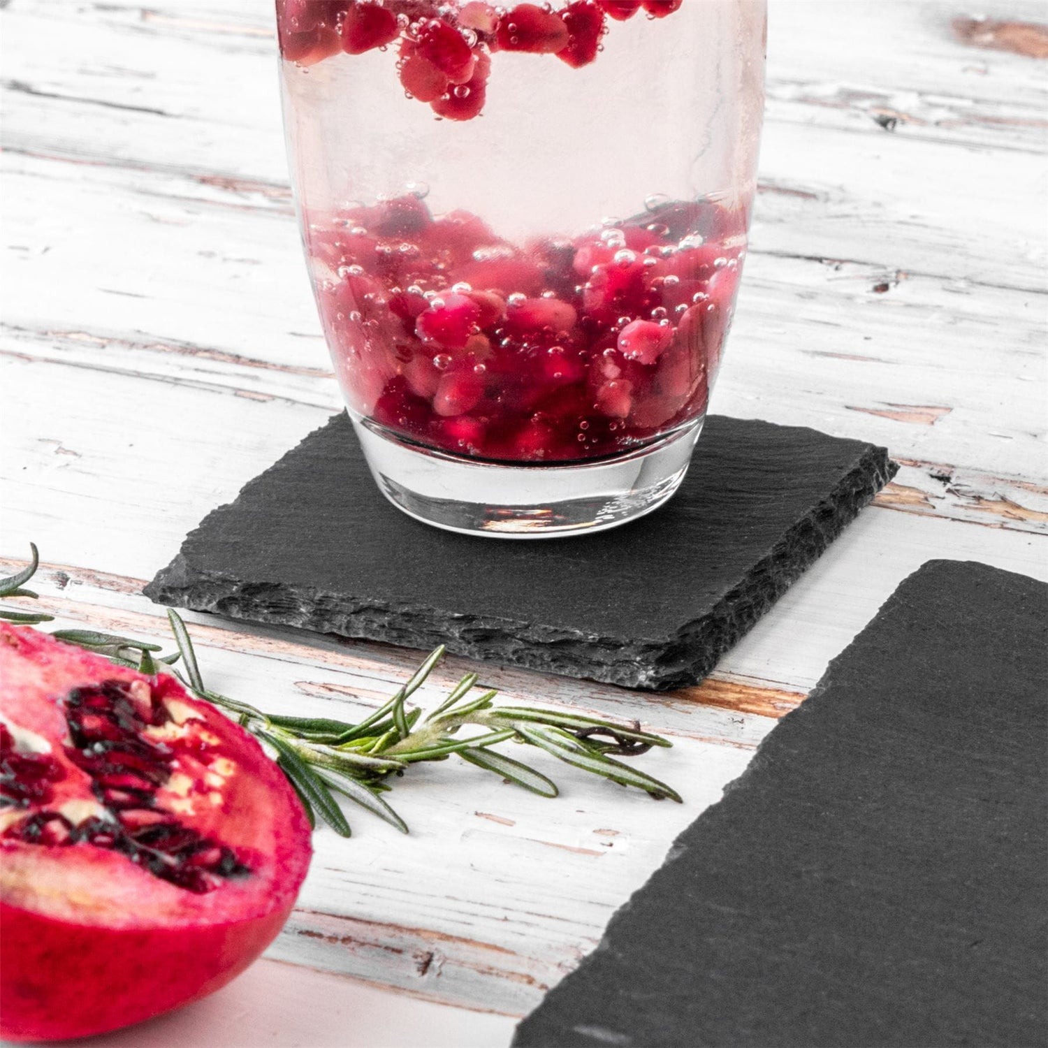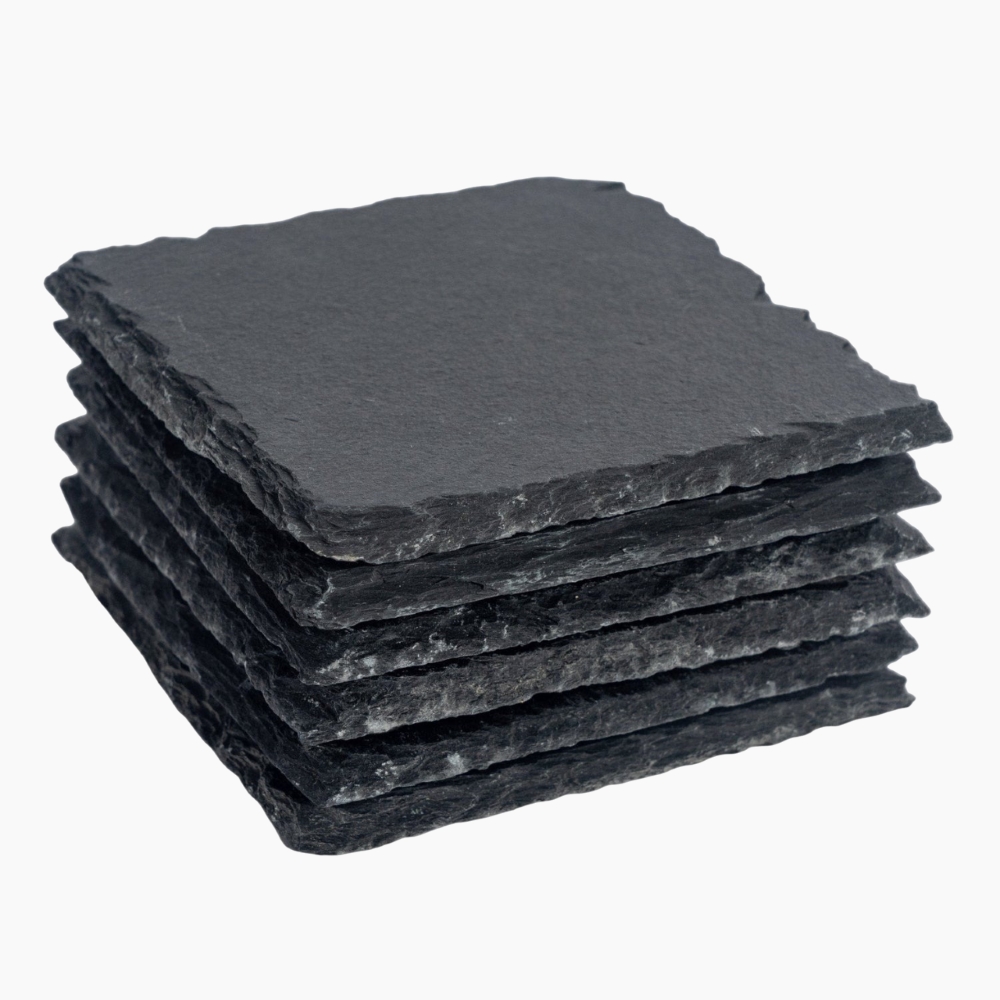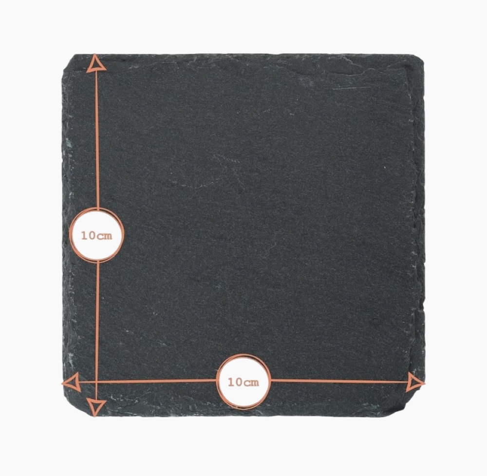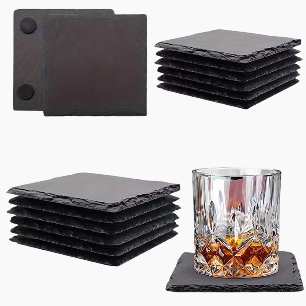 Podmetači za čaše dolaze u setu od 6 komada. Podmetači su napravljeni od prirodnog kamena sedimentno crne boje. Sa donje strane podmetača na 4 ugla nalaze se obloge od Eva pene kako bi se sprečile ogrebotine.