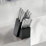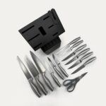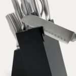Set dolazi sa sofisticiranim srebrnim postoljem dimenzija 16,5 x 14,6 x 37,5 cm, koje ne samo da čuva vaše noževe uredno organizovane, već i dodaje prefinjeni vizuelni element vašoj kuhinji. Integrisani oštrač omogućava brzo i jednostavno održavanje vrhunske oštrine, čineći svaki nož spremnim za upotrebu u bilo kom trenutku.