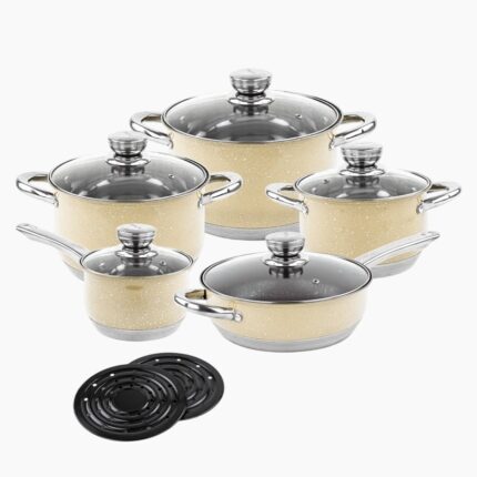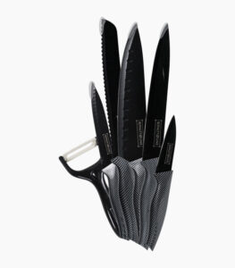 Royalty Line RL-CB5 je set kuhinjskih noževa osmišljen za sve koji žele lako, sigurno i precizno rezanje, bilo da tek započinju svoje kulinarsko putovanje ili već vladaju kuhinjom poput profesionalnog šefa. Svaki nož izrađen je od nehrđajućeg čelika visoke izdržljivosti, a dodatno zaštićen keramičko-neljepljivim premazom, koji sprečava lepljenje namirnica i omogućava čišćenje u svega nekoliko sekundi.