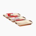 Royalty Line RL-CC3 je premium set od tri tepsije za rernu, izrađen od visokokvalitetnog ugljeničnog čelika sa troslojnim antibakterijskim granitnim premazom. Nelepljiva površina omogućava zdravije pečenje bez dodatne masnoće, a uklonjive silikonske ručke otporne do 240°C obezbeđuju sigurno rukovanje. Ekološki prihvatljiv, izdržljiv i lak za čišćenje, ovaj set je idealan izbor za pripremu jela u rerni, od mesa i povrća do slatkih specijaliteta.