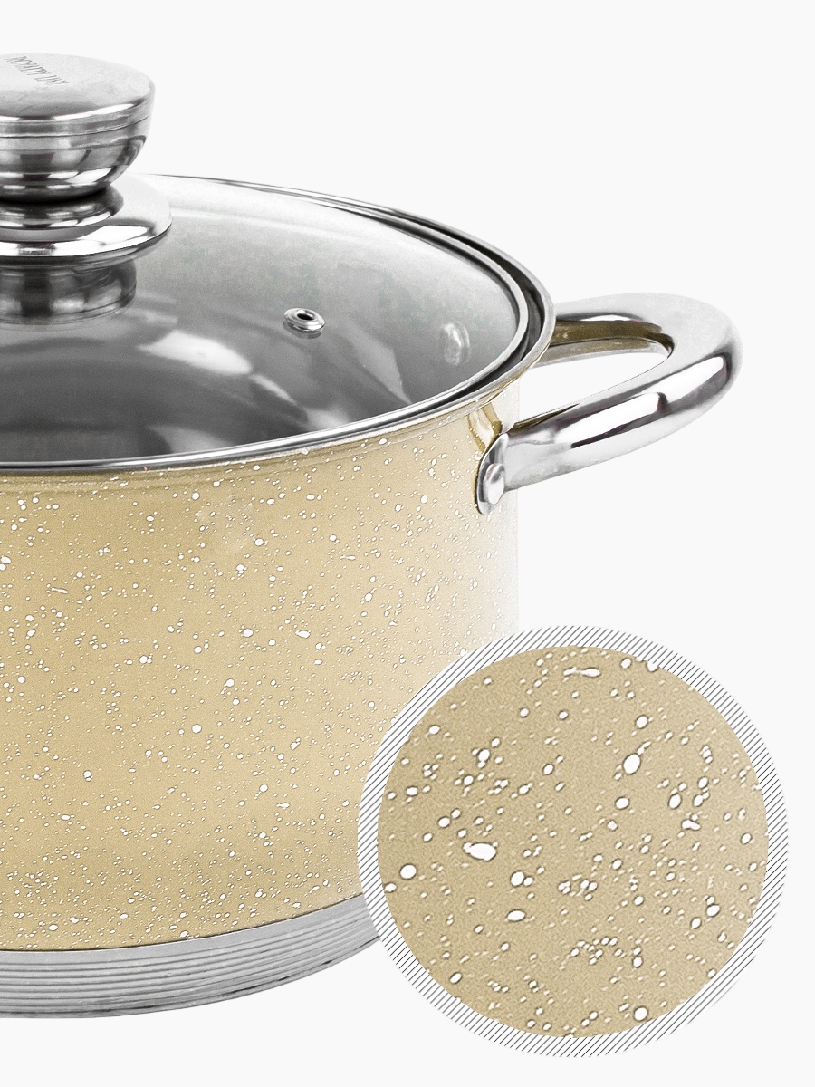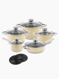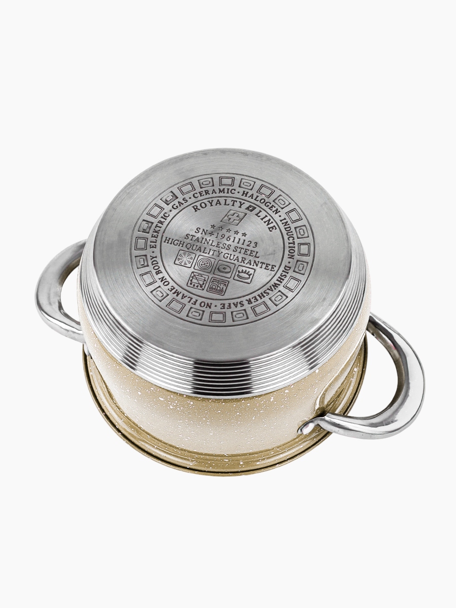 Set posuđa od 12 delova cream – Royalty Line izrađen je od visokokvalitetnog nerđajućeg čelika. Pogodan je za sve vrste šporeta, a čišćenje je jednostavno i brzo zbog mogućnosti pranja u mašini za suđe. Posude imaju čelične ručke, a stakleni poklopci su od visokokvalitetnog kaljenog stakla.