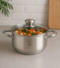 Swiss Zürich Z Line šerpa od nerđajućeg čelika – pouzdana i elegantna šerpa za sve vrste šporeta, sa sedmoslojnim dnom za brzo i ravnomerno kuvanje. Dostupna u dimenzijama: 16 cm, 18 cm i 20 cm. Idealna za kuvanje supa, sosova, testenina i svakodnevnih jela.